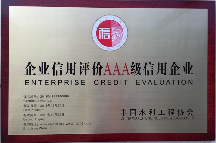 熱烈慶祝我司榮獲水利3A信用等級證書